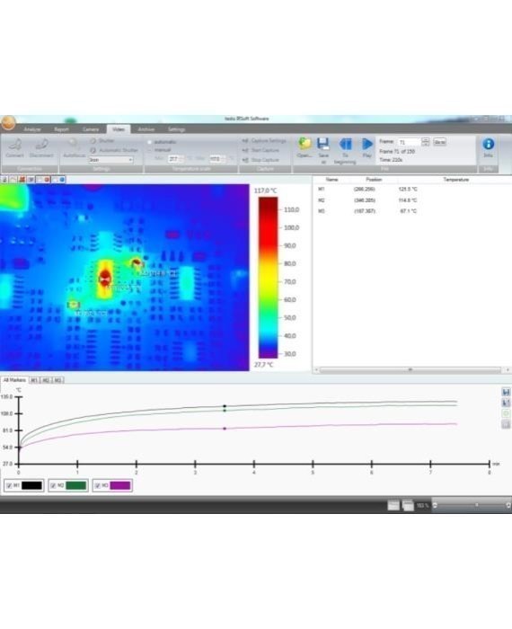 При проведении термографического обследования объектов в сложных производственных условиях, последовательность снимков сохраняется непосредственно в тепловизоре, что позволяет отслеживать все стадии тепловых процессов в заданном интервале времени, с использованием ПО IRSoft. Кроме того, Вы можете сохранить последовательность снимков, как полностью радиометрическое видео, при подключении тепловизора к ПК, для дальнейшего увеличения масштаба и дательного анализа.
